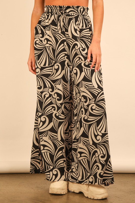 Printed wide leg pants are fashionable bottoms featuring a bold or intricate print that adds personality to your outfit. These pants have a wide leg silhouette that offers a relaxed and flowy fit. Perfect for making a statement and adding a touch of flair to your wardrobe, printed wide leg pants can be dressed up with a blouse or down with a casual top for a versatile and chic look.
