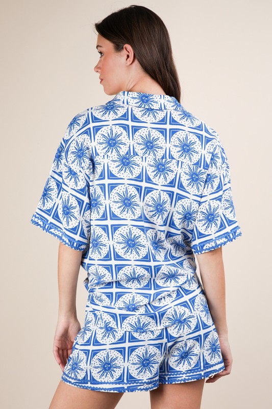 A tropical printed shirt top and shorts set is a stylish and coordinated outfit choice for warm weather. The vibrant print evokes a vacation-ready vibe, while the matching top and shorts create a cohesive and put-together look. This set is perfect for beach days, summer outings, or tropical getaways. Pair it with sandals and sunglasses for a trendy and effortless ensemble.