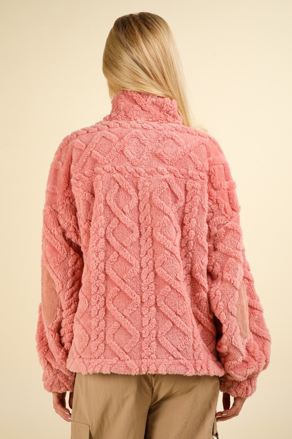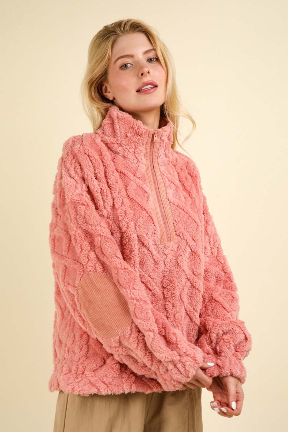 The Fuzzy Fleece Half Zip Cable Pattern Sweatshirt combines cozy warmth with stylish details. The half zip design allows for adjustable ventilation and a modern touch, while the elbow corduroy patches add a unique texture and durability. Its long sleeves and mock neck provide extra comfort and protection against the chill. The cable pattern gives it a classic, textured look, making it a great choice for both casual and relaxed settings. Perfect for layering, this sweatshirt offers both comfort and style.