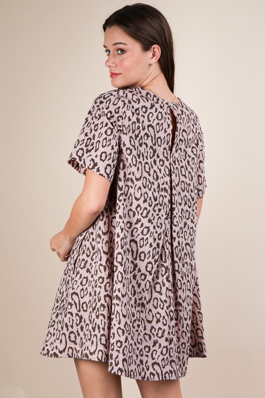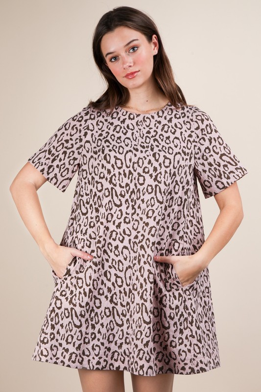 A leopard-printed comfy mini dress is a trendy and comfortable piece with a stylish animal print pattern. This dress combines a fashionable leopard print with a relaxed and easy-to-wear mini-length silhouette. Perfect for both casual outings and adding a touch of flair to your wardrobe, this dress is a versatile and on-trend choice for any fashionista.