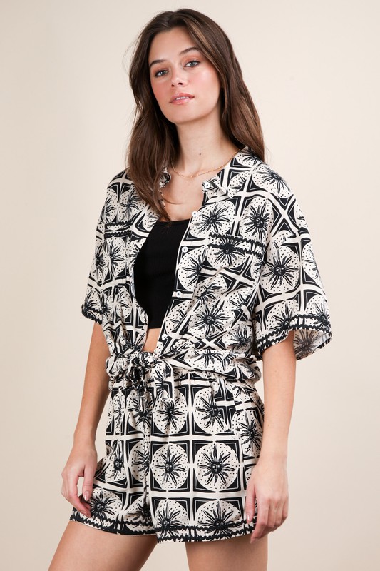 A tropical printed shirt top and shorts set is a stylish and coordinated outfit choice for warm weather. The vibrant print evokes a vacation-ready vibe, while the matching top and shorts create a cohesive and put-together look. This set is perfect for beach days, summer outings, or tropical getaways. Pair it with sandals and sunglasses for a trendy and effortless ensemble.