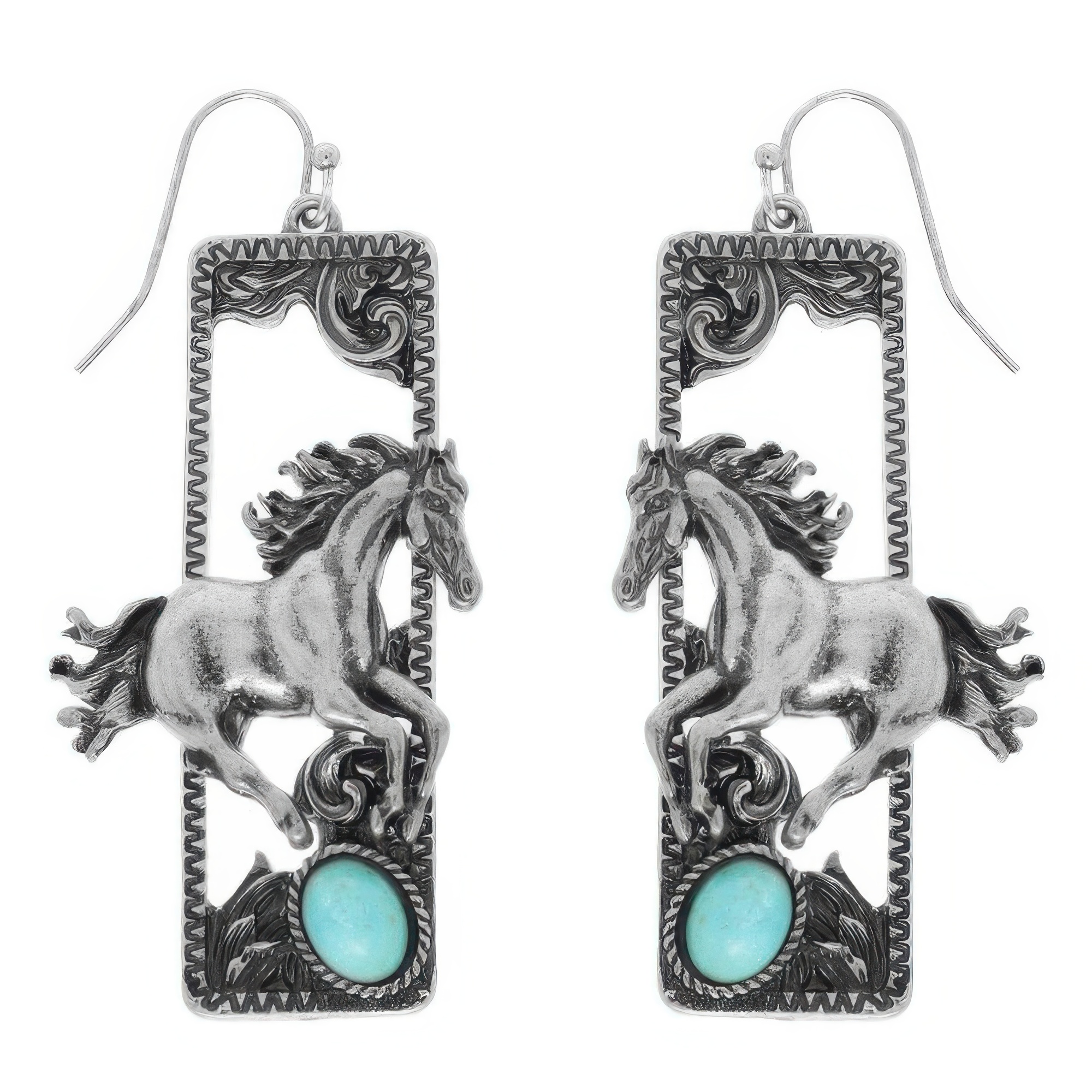 Gallop into bold western style with these Wild Horse Dangle Earrings. Featuring turquoise accents and crafted in oxidized-toned metal, these earrings blend spirit and symbolism. Perfect for rodeos, country fairs, or casual looks with flair, they’re a standout addition to your cowgirl-inspired collection.