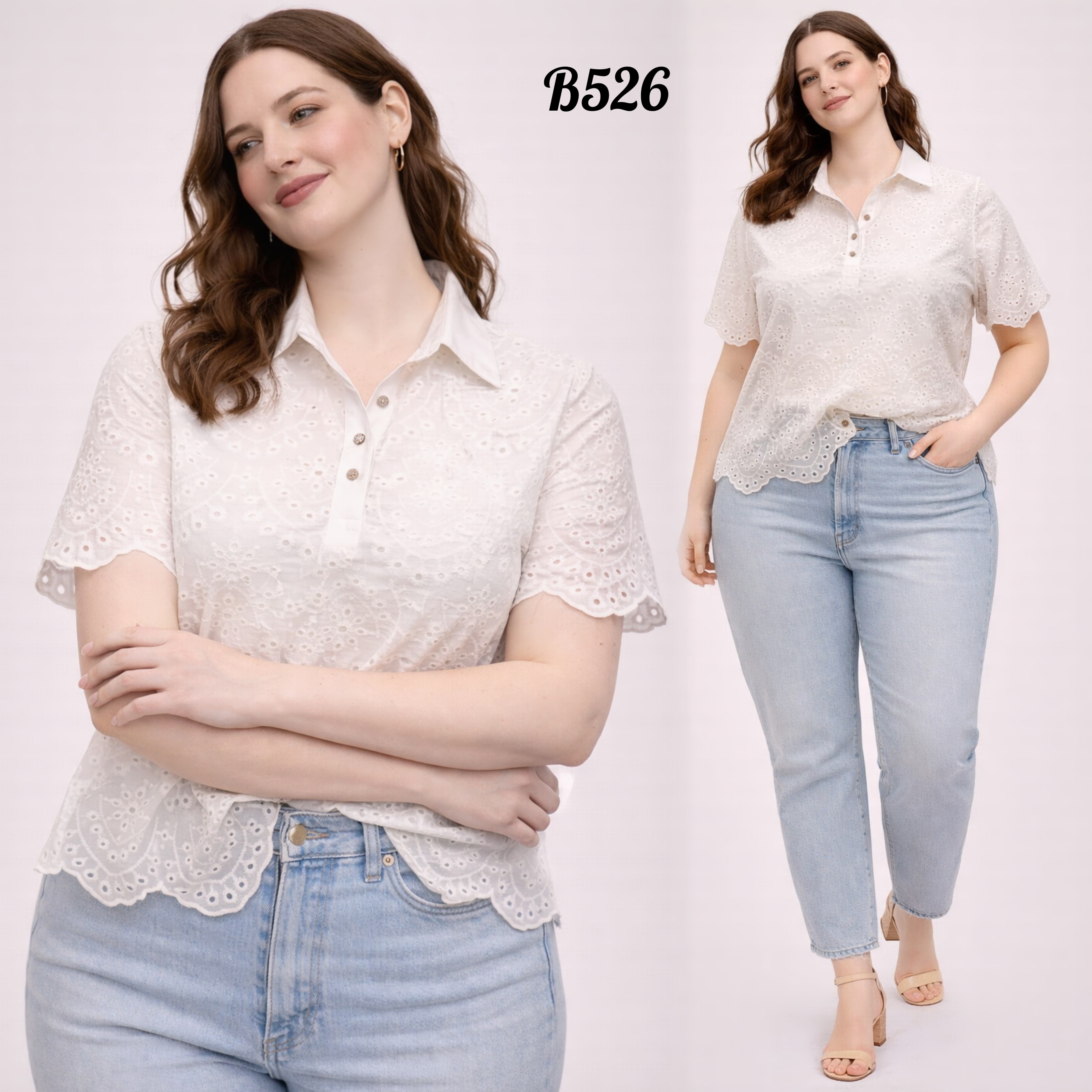 Fresh and feminine, this white eyelet polo blouse brings effortless charm to your everyday wardrobe. Designed with a classic collared neckline and a button-front placket, it offers a polished yet relaxed look. The delicate eyelet texture adds visual interest while keeping the fabric light and breathable. Scalloped edging enhances its soft, refined appeal with a subtle decorative finish. Its easy, relaxed fit allows for comfortable wear throughout the day. Perfect for pairing with denim, skirts, or tailored pieces, this blouse transitions seamlessly from casual outings to more dressed-up moments.