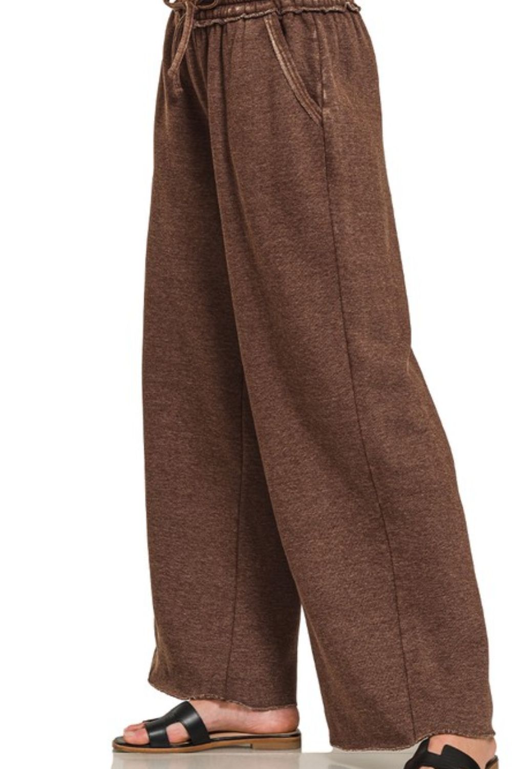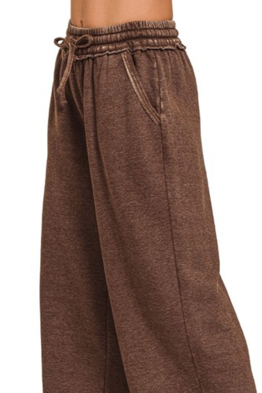 Acid wash fleece palazzo sweatpants with pockets are a trendy and comfortable twist on traditional sweatpants. The acid wash design gives these sweatpants a unique and edgy look, perfect for a casual and stylish outfit. The fleece material provides warmth and coziness, making these pants ideal for lounging or running errands on colder days. The palazzo silhouette features a wide leg that adds a fashionable touch to the classic sweatpant style. The addition of pockets adds functionality and convenience, allowing you to carry small essentials with you. These acid wash fleece palazzo sweatpants with pockets can be paired with a simple t-shirt or sweatshirt for a laid-back and on-trend look that combines comfort with fashion.