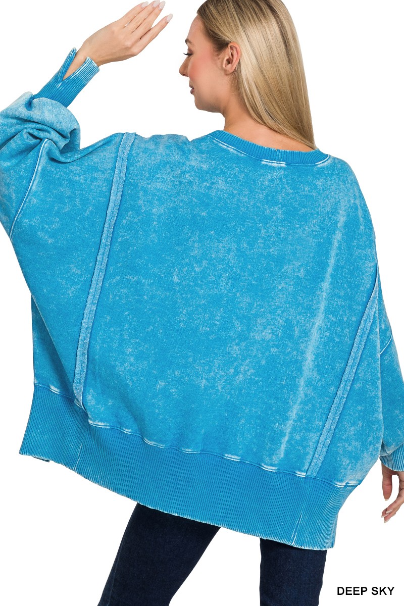 Zenana Acid Washed Batwing Sleeve Fleece Sweatshirt