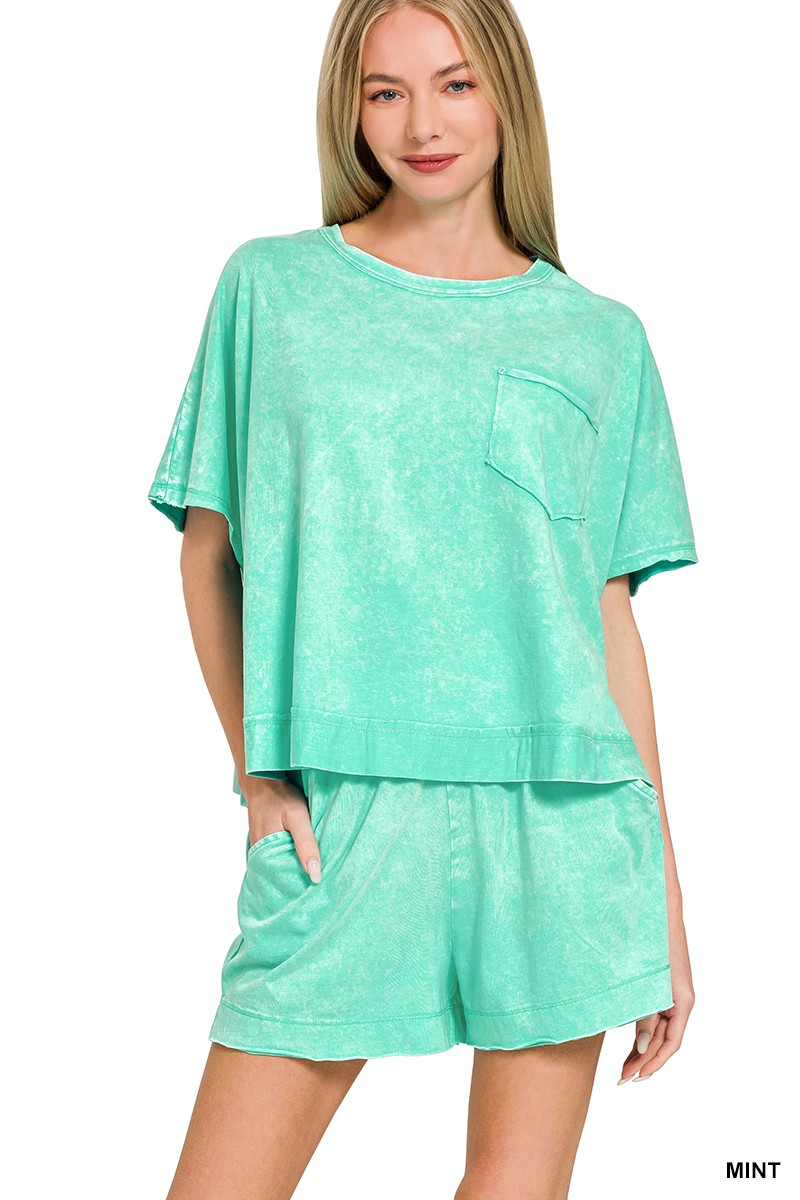 The Acid Washed Oversized Top & Shorts Set offers a cool and edgy vibe. The acid wash effect adds a trendy and distressed look to the set. The oversized top provides a relaxed and comfortable fit. Perfect for a laid-back and casual outfit, ideal for lounging or running errands. This set is a stylish and effortless choice for a modern and relaxed aesthetic.