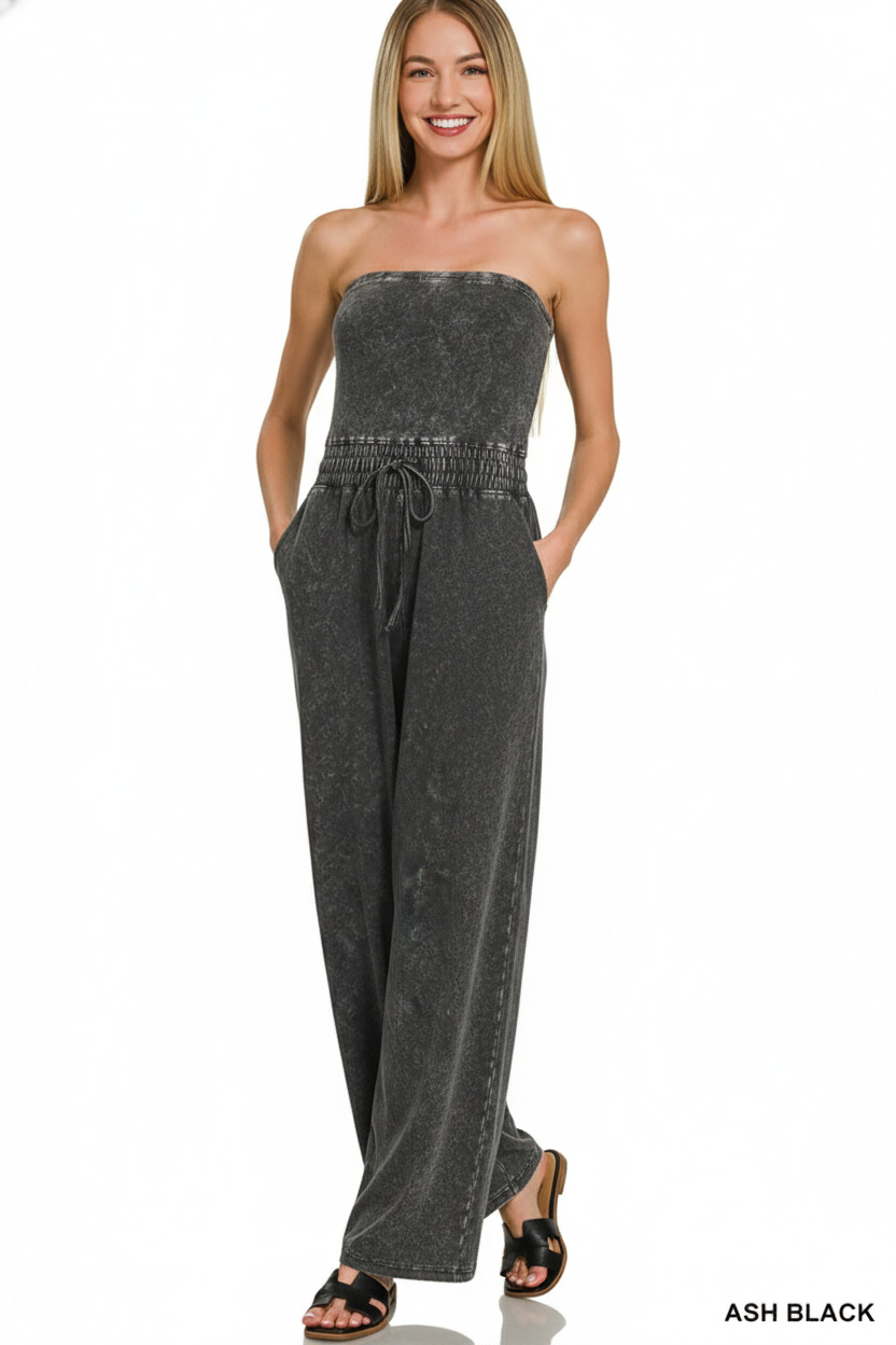 This acid washed strapless tube top jumpsuit will add a touch of edgy style to your wardrobe. The strapless design creates a sleek and alluring silhouette, perfect for a night out or a special event. The acid washed finish gives this jumpsuit a unique and retro-inspired look that will make you stand out from the crowd. Pair it with some statement accessories and heels for a complete fashion-forward ensemble. Get ready to turn heads and make a bold fashion statement in this trendy jumpsuit!