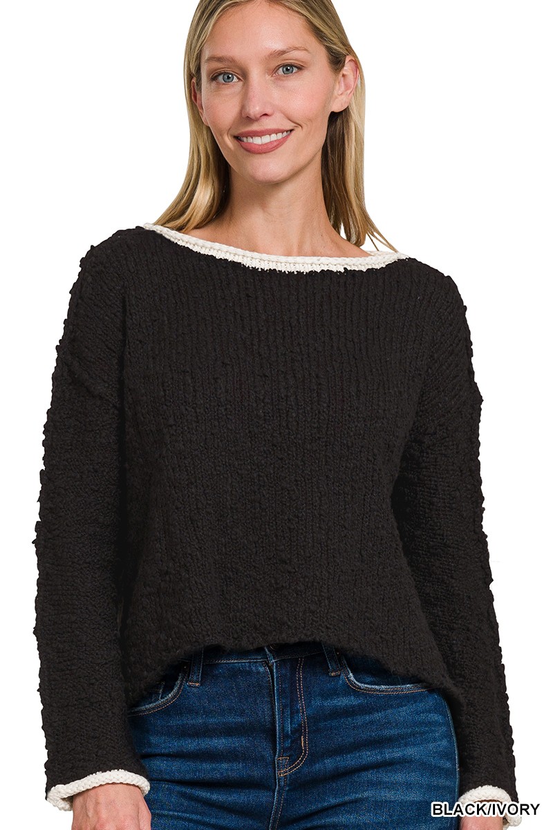The Contrast Trim Cropped Sweater is a trendy and eye-catching piece that will elevate your wardrobe. Featuring contrasting trims that add a playful touch to the design, this sweater is both stylish and unique. The cropped length offers a modern silhouette that is perfect for layering or wearing on its own. Made from cozy and soft fabric, this sweater provides comfort without compromising style. Add a pop of color and fun to your outfit with the Contrast Trim Cropped Sweater for a fashion-forward look.