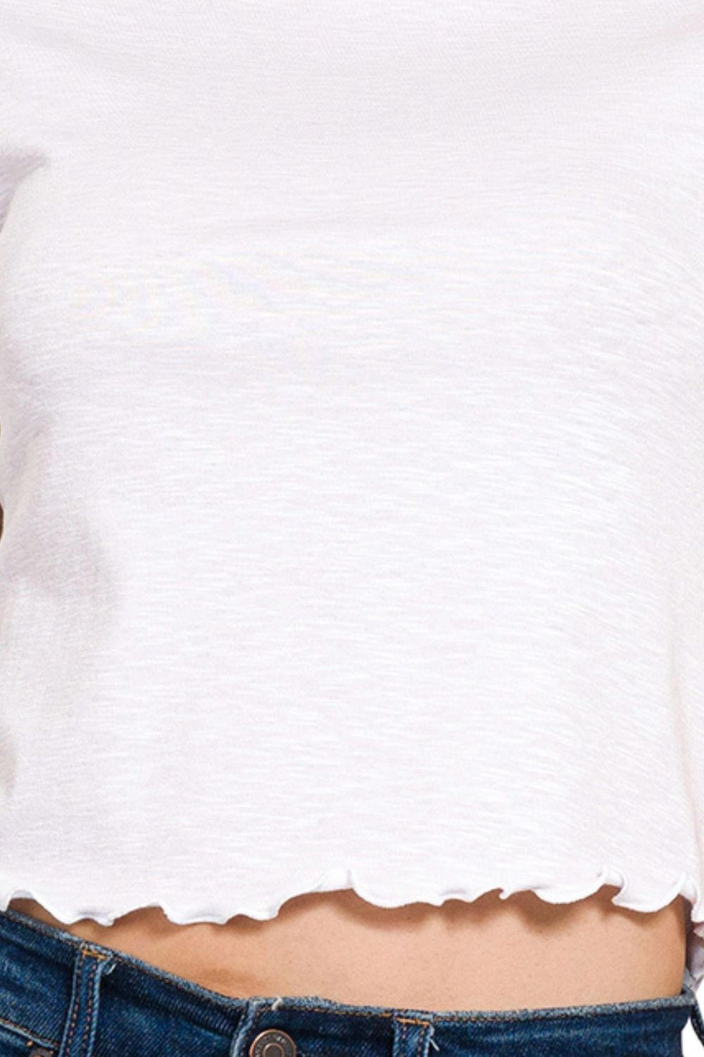 This cotton modal slub lettuce trimmed cropped t-shirt is a cute and trendy choice for your casual outfits. The blend of cotton and modal fabrics ensures a soft and comfortable feel against the skin. The lettuce trim detail adds a playful and feminine touch to the cropped t-shirt. With a cropped silhouette, this t-shirt is perfect for pairing with high-waisted bottoms for a stylish look. Stay on-trend and comfortable with this chic cropped t-shirt.