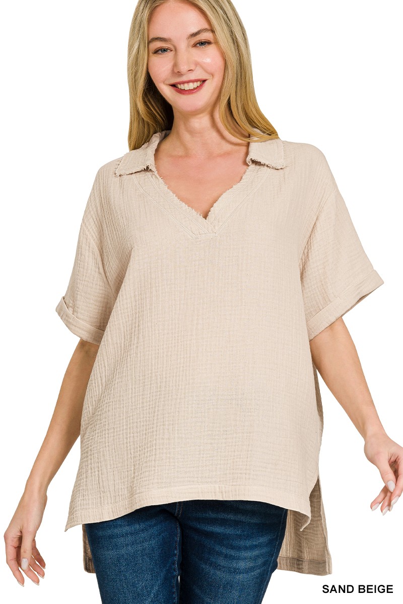 Zenana Double Gauze Short Sleeve High-Low Top
