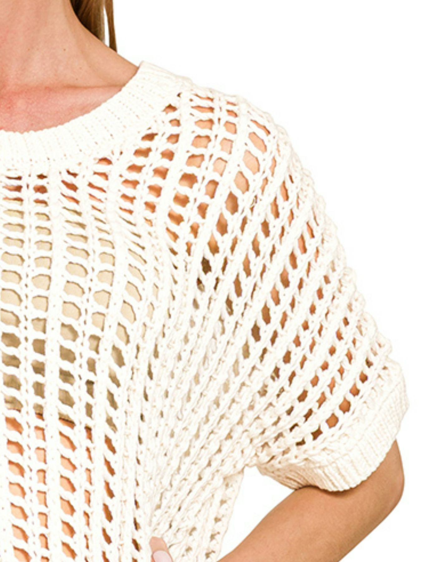 This fishnet crochet knit cover-up features short sleeves for a stylish and breezy look. The fishnet design adds a touch of texture and edginess to the cover-up. Perfect for layering over swimwear or pairing with a tank top and shorts for a trendy outfit. Embrace a bohemian vibe with this versatile and chic cover-up. Elevate your beachwear or summer wardrobe with this fashionable fishnet crochet knit piece.