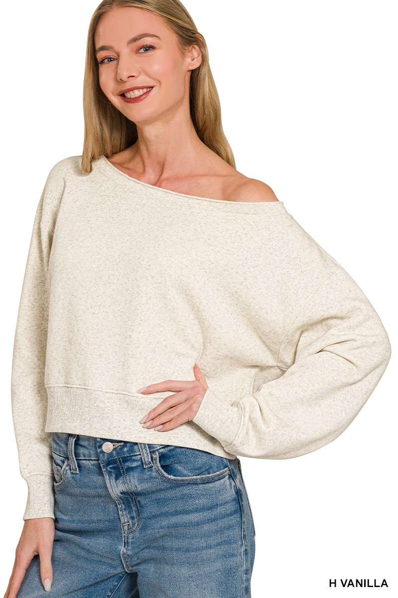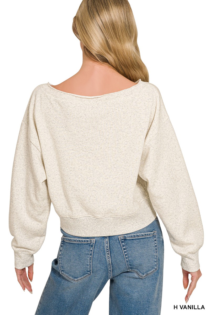 This cropped sweatshirt features a boat neckline and long sleeves, offering a relaxed and comfortable fit. Made from a soft and cozy fabric, it's perfect for layering or wearing on its own. The cropped length adds a fashion touch, making it a versatile addition to any wardrobe. Ideal for casual outings or lounging at home, this sweatshirt combines style and comfort effortlessly. The material is a blend of cotton and polyester, ensuring durability and easy care. Its relaxed fit and boat neck design make it a flattering choice for various body types.