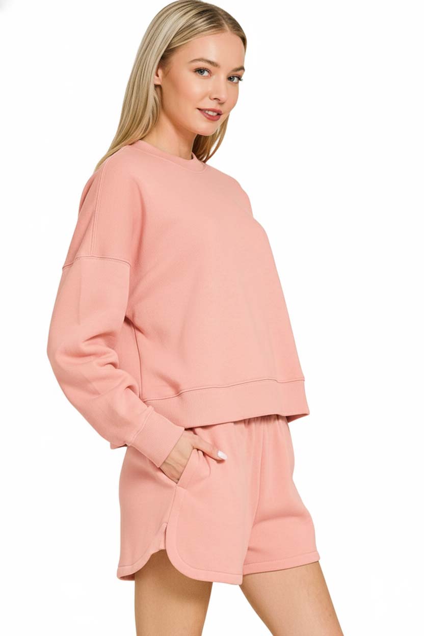 This fleece long sleeve sweatshirt and shorts set is a cozy and stylish option for lounging or casual outings. The soft fleece material provides warmth and comfort for all-day wear. The long sleeve sweatshirt features a classic design with a relaxed fit. The matching shorts complete the set for a coordinated look. Perfect for relaxed and laid-back days.