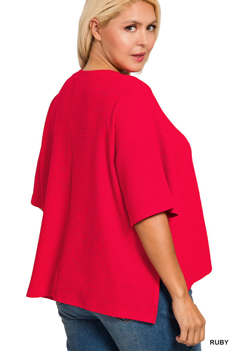 This T-shirt is a stylish and comfortable addition to any wardrobe. Made from a soft, textured knit fabric, it offers a relaxed fit and features short sleeves and a round neckline. The vibrant ruby red color adds a pop of color, while the side slits provide a modern touch. Perfect for casual wear, this T-shirt is easy to care for and offers all-day comfort. The textured knit adds visual interest and a unique feel, setting it apart from basic tees. Its breathable material makes it ideal for warmer weather, while its versatile design allows it to be dressed up or down.