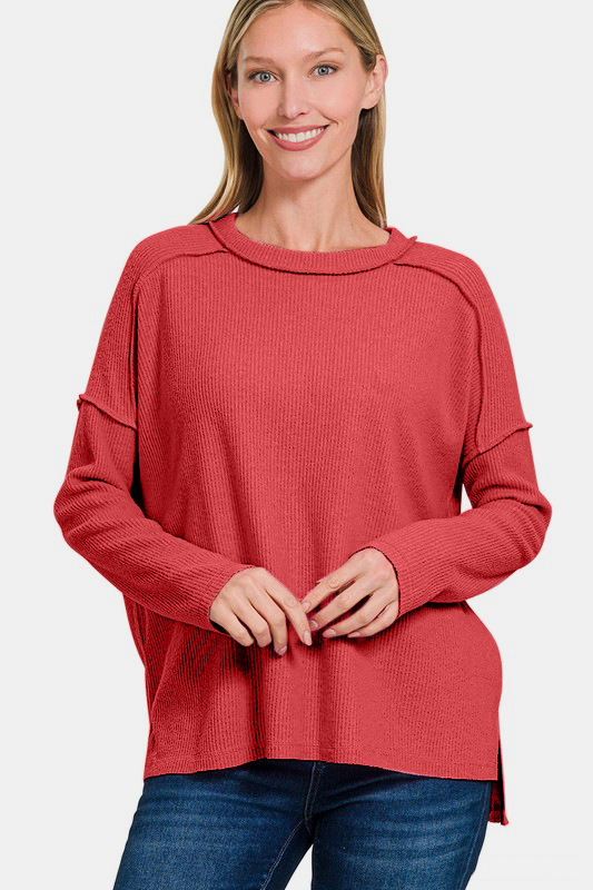 Zenana Full Size Exposed Seam Brushed Round Neck Sweater