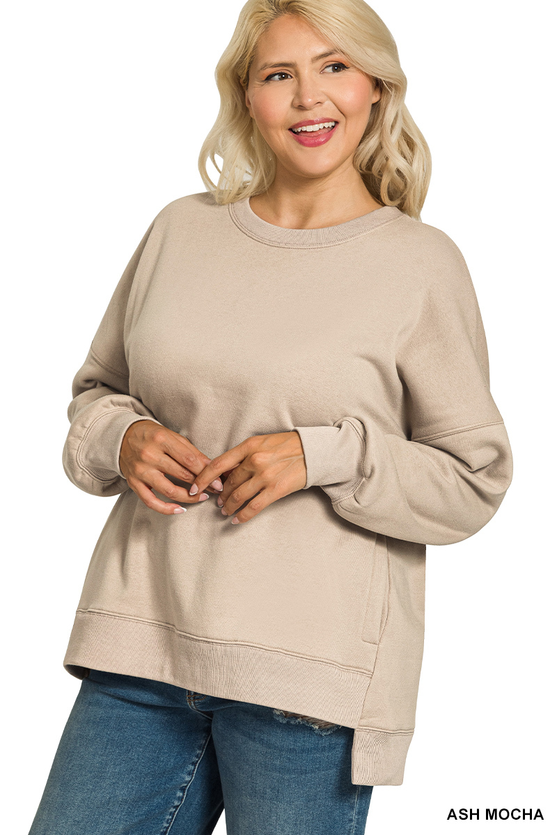 This Zenana Full Size Fleece Hi-low Boyfriend Sweatshirt is a must-have addition to your wardrobe. Crafted from soft and cozy fleece, this sweatshirt offers ultimate comfort and warmth. The relaxed boyfriend fit provides a laid-back and stylish look, while the hi-low hemline adds a touch of modern flair. Featuring convenient side pockets, this sweatshirt is perfect for carrying your essentials. Available in plus sizes, it caters to a wide range of body types. Whether you're lounging at home or running errands, this versatile sweatshirt is a perfect choice. Its durable construction ensures long-lasting wear, making it a staple piece in your closet. The sweatshirt's material is a blend of cotton and polyester, offering both comfort and durability. The relaxed fit and hi-low hemline make it a fashion and fashionable choice for any casual occasion.