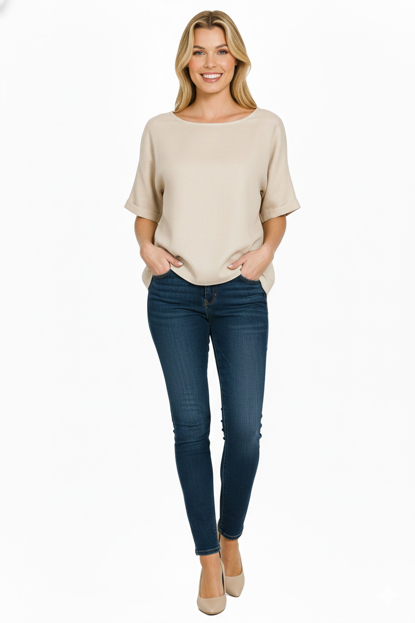 Zenana Linen Round Neck Cuffed Sleeve Top