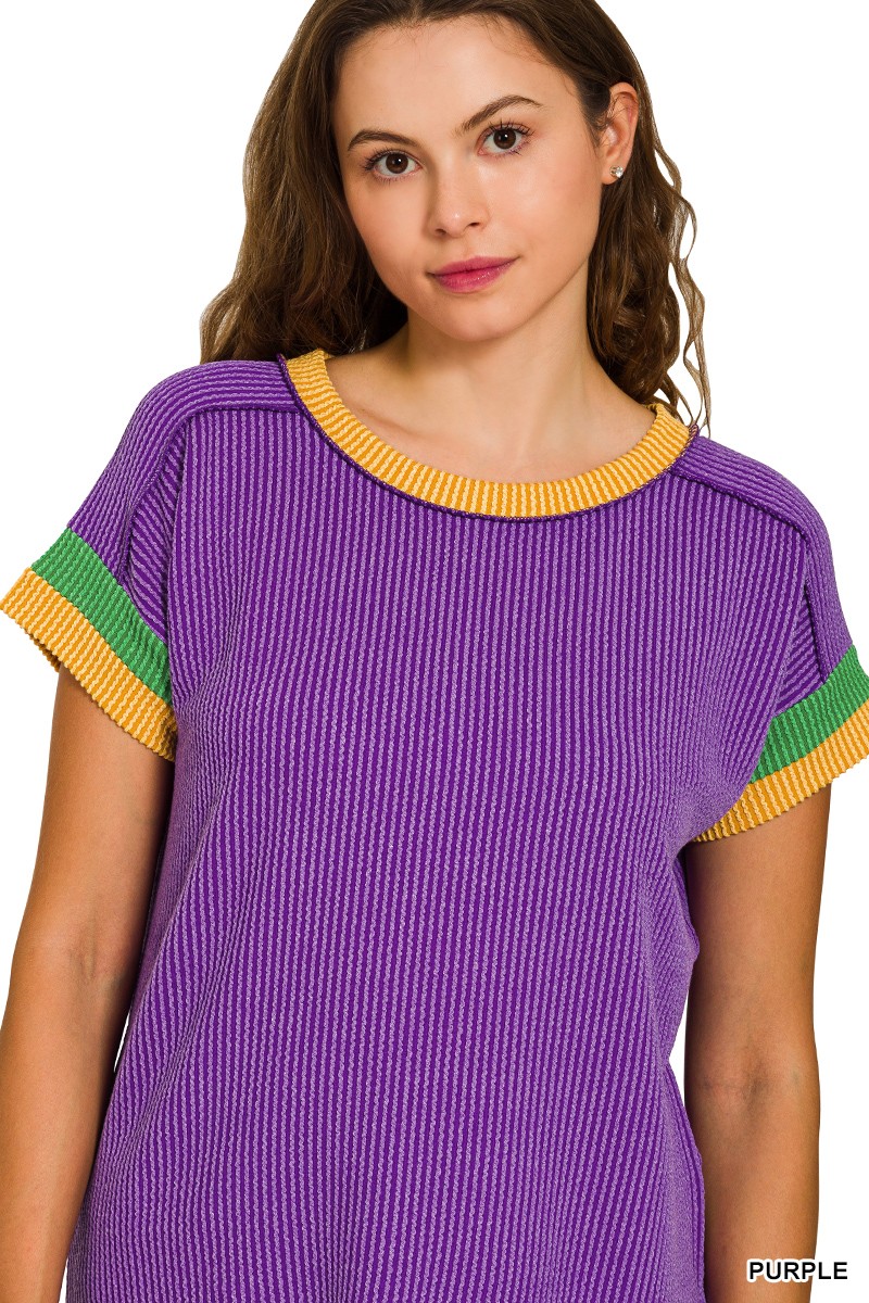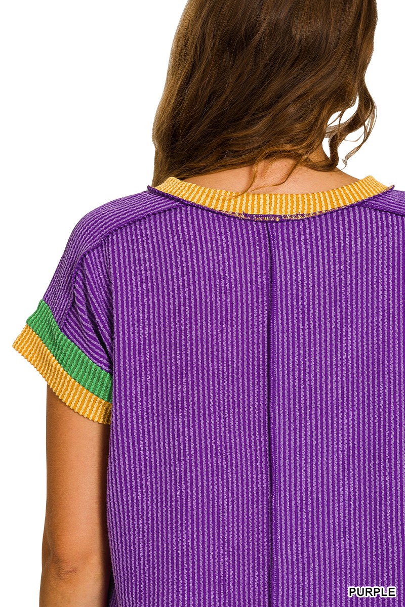 Get ready to stand out in style with this Mardi Gras Raised Rib Contrast Trim Top, perfect for making a bold fashion statement. The raised rib texture adds a unique and eye-catching element to the top, adding depth and dimension to your outfit. The contrast trim detailing provides a pop of color and visual interest, creating a vibrant and playful look. With its Mardi Gras-inspired design, this top is ideal for adding a festive touch to your wardrobe. Elevate your ensemble with this standout piece that is sure to turn heads and showcase your individual style.