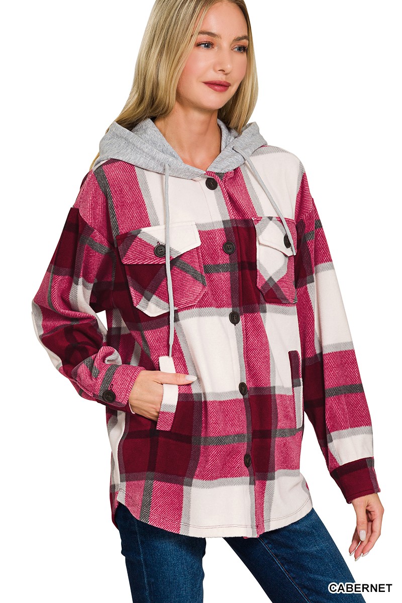 Zenana Plaid Drawstring Hooded Fleece Shacket