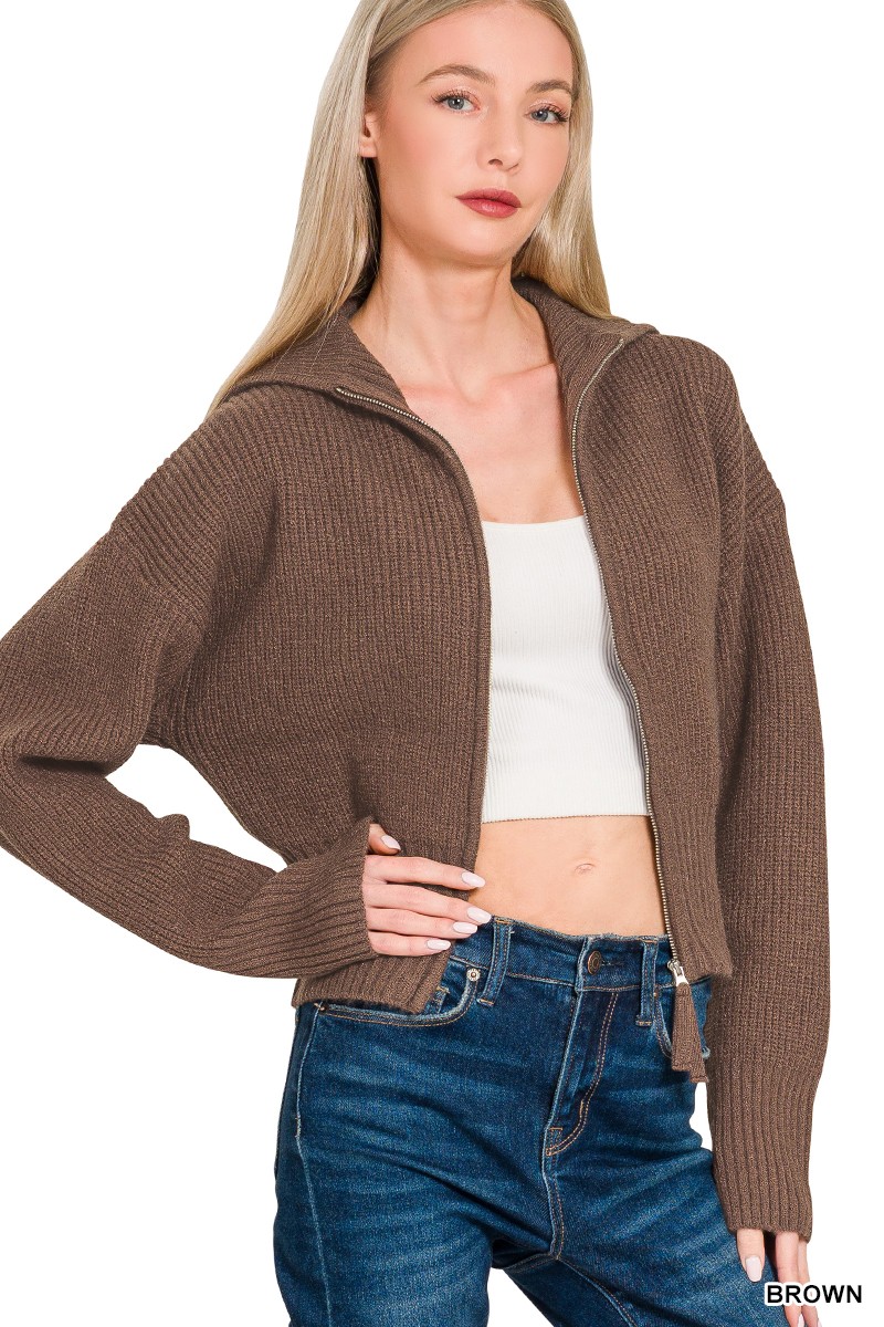 This cozy knit zip-up cardigan is a versatile addition to any wardrobe. Made from a soft and comfortable knit fabric, it features a full zip-up closure, ribbed collar, cuffs, and hem for a snug fit. The relaxed silhouette makes it easy to layer over any outfit, while the stylish design adds a touch of sophistication. Perfect for casual outings or cozy nights in, this cardigan is a must-have for any fashion-conscious individual. The material is primarily a knit blend, offering both warmth and breathability.