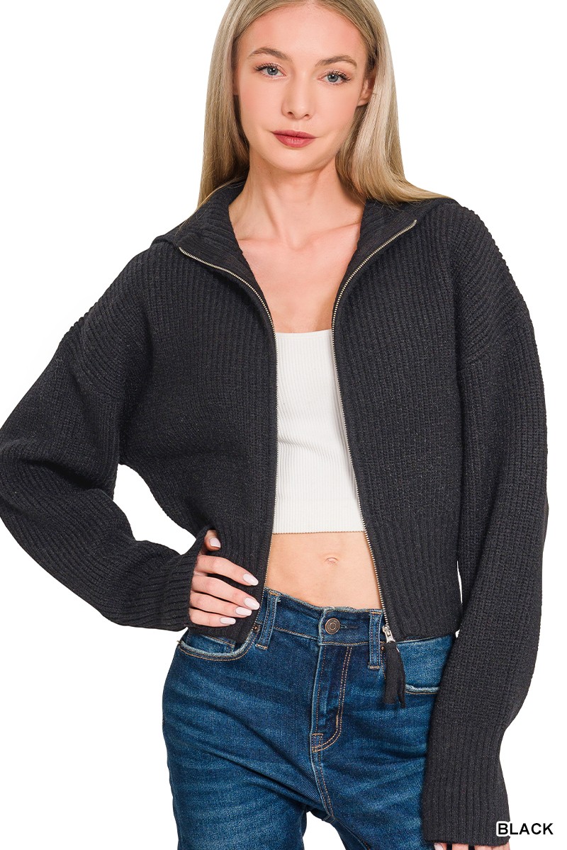 This ribbed knit zip-up cardigan offers a blend of comfort and style. Crafted from a soft, high-quality knit, it features a full zip-up closure and a relaxed fit, making it perfect for layering. The collared neckline adds a touch of sophistication, while the cropped length keeps it modern and on-trend. Ideal for casual outings or cozy evenings, this cardigan is a versatile addition to any wardrobe. The ribbed texture enhances its visual appeal and provides a comfortable, flexible fit.