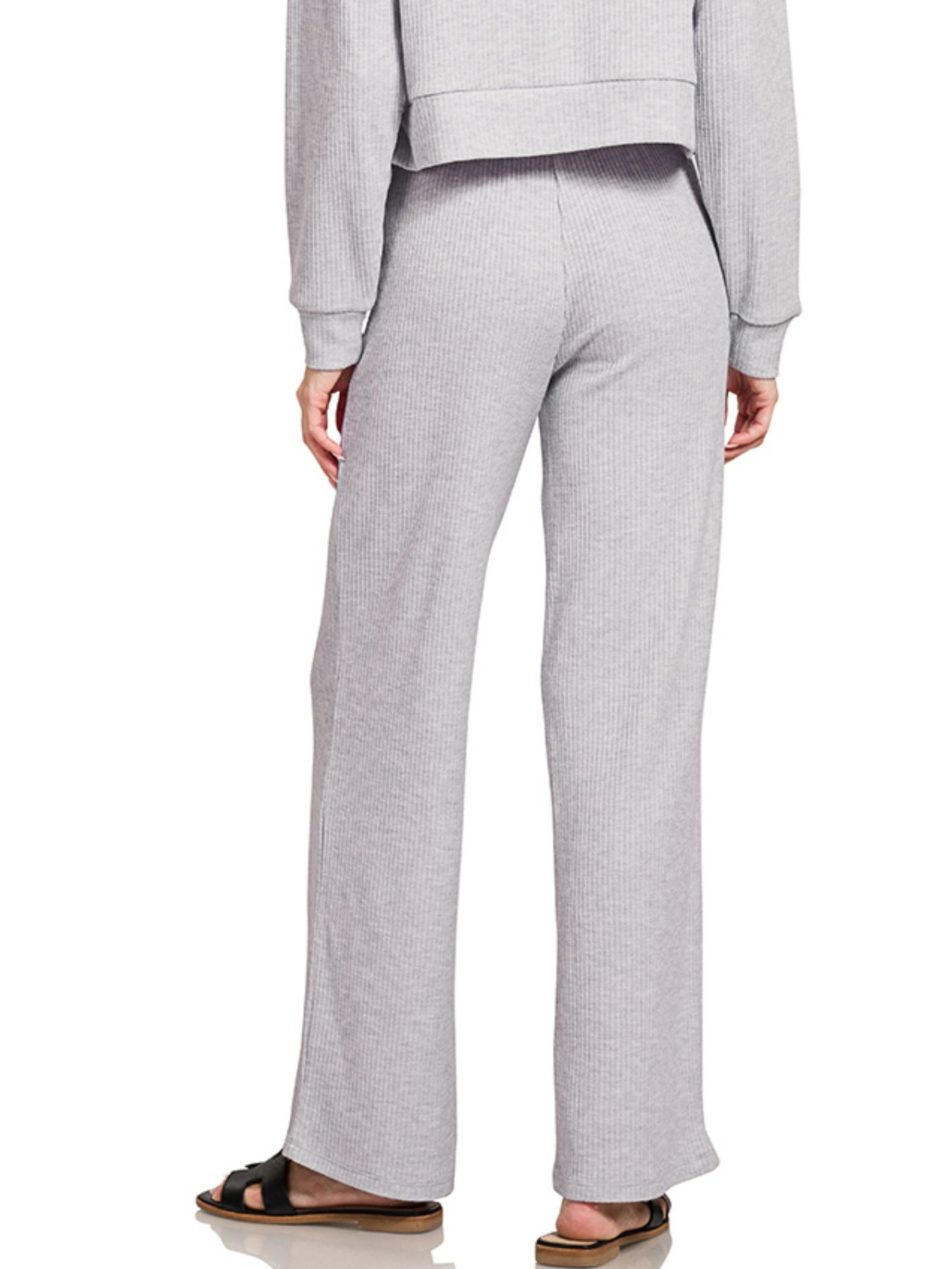 These comfortable wide-leg lounge pants feature a soft ribbed knit construction in an elegant sage green color. The relaxed fit design includes an adjustable drawstring waistband for personalized comfort and easy wear. Made from breathable lightweight fabric, these pants offer the perfect balance of style and comfort for lounging at home or casual everyday wear. The wide-leg silhouette provides freedom of movement while maintaining a flattering appearance.