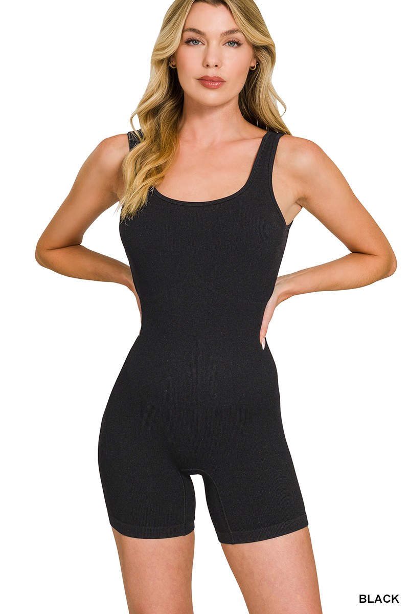 This ribbed seamless romper is crafted with high-stretch, seamless ribbed fabric that delivers a smooth, second-skin fit and targeted body-contouring support. The sleek, streamlined design flatters your natural shape while staying comfortable for all-day wear. Its one-piece silhouette combines effortless style with practicality, making it perfect for casual outings, lounging, or active daily looks. The soft, breathable ribbed texture adds subtle texture and keeps the look modern and polished.