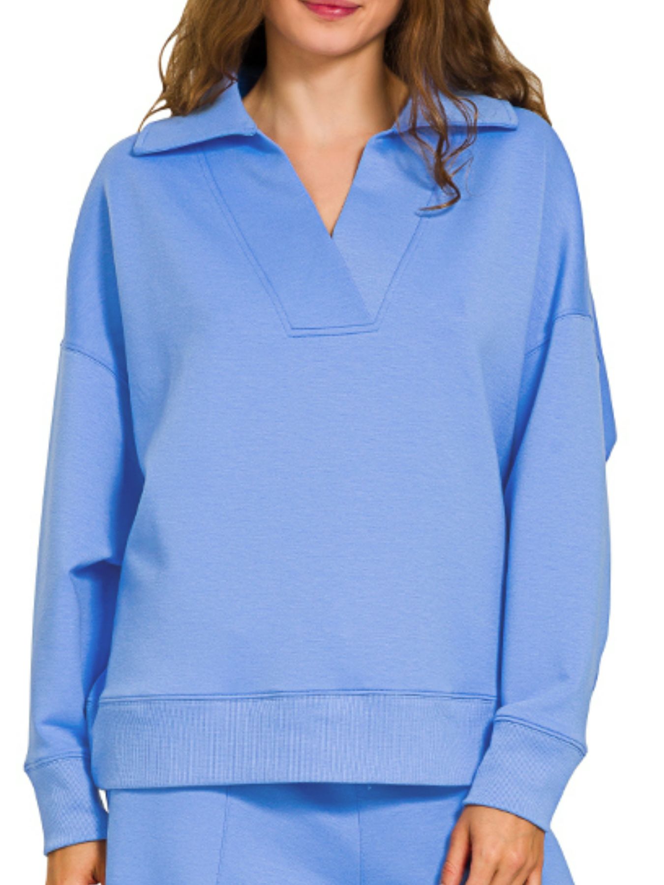 Step up your loungewear game with this sleek scuba collared pullover and pants set. The scuba material offers a modern and stylish look, while the collared design adds a touch of refinement. Perfect for relaxing at home or running errands in comfort and style. Elevate your casual wear with this coordinating set. A must-have addition to your leisure wardrobe.