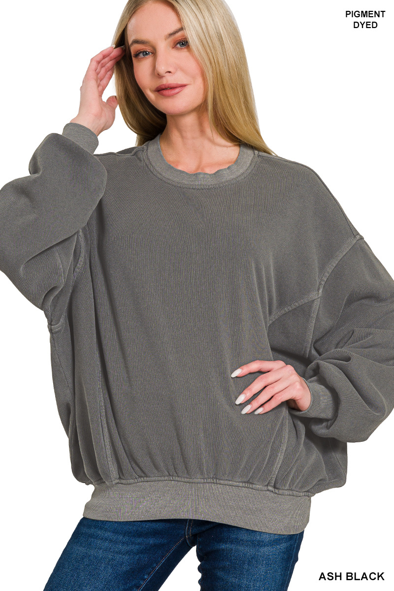 Product Description This Soft Fleece Pigment Dye Pullover is a cozy and stylish addition to your wardrobe. The fleece material provides comfort and warmth. The pigment dye gives it a fashionable and unique look. Perfect for layering in chilly weather. A versatile piece that can be dressed up or down for any occasion.Features:Oversized,RibbedStretch:Slightly stretchyMaterial composition:80%COTTON, 20%POLYESTERCare instructions:Machine wash cold. Tumble dry low.Imported