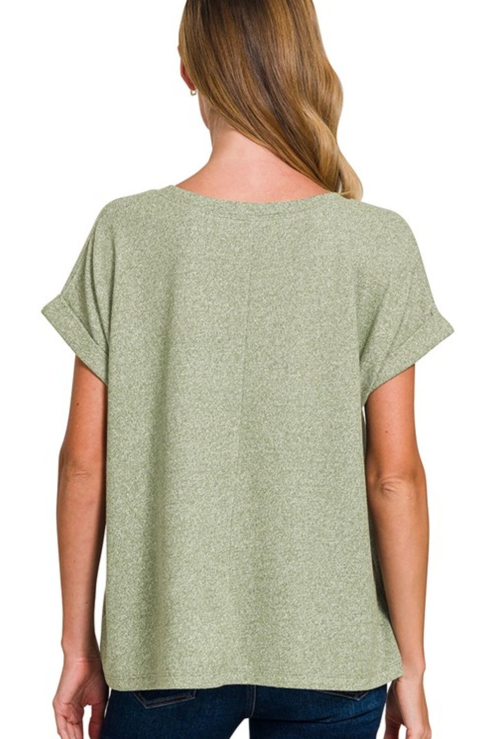 This classic V-neck t-shirt features a comfortable heathered blue fabric that's perfect for casual everyday wear. Made from a soft, breathable knit material that offers natural stretch and durability. The relaxed silhouette with dropped shoulders and rolled sleeves creates an effortlessly stylish look. The v-neckline adds a feminine touch while the high-low hem provides extra coverage. Easy to care for and maintain, this versatile piece pairs well with jeans, shorts, or skirts for multiple styling options.