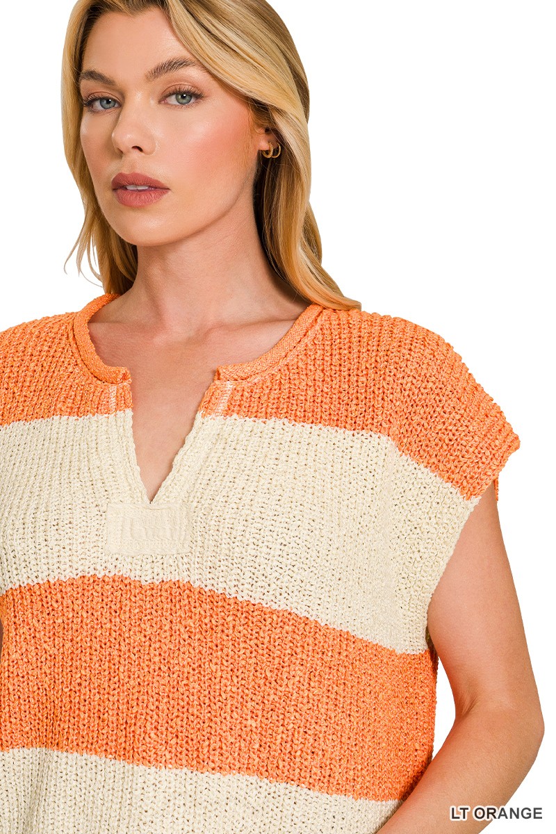 This Split Neck Sleeveless Stripe Sweater is a stylish and versatile addition to your wardrobe. The split neck detail adds an interesting twist to the classic sweater style. Featuring a chic stripe pattern, this sweater is perfect for both casual and semi-formal occasions. With its sleeveless design, it's great for layering or wearing on its own in warmer weather. Stay on trend and comfortable with this modern twist on a classic wardrobe staple.