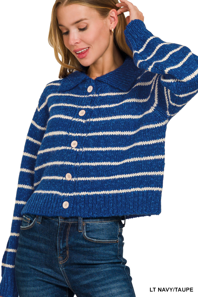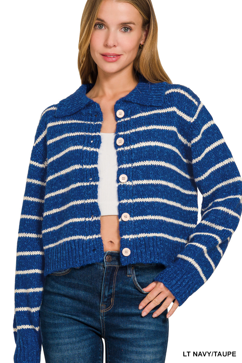 This stylish cardigan is crafted from a soft knit fabric, ensuring a comfortable and cozy feel. It features a classic collar and a button-down closure, making it easy to wear and style. The eye-catching striped pattern adds a touch of sophistication, while the cropped length offers a modern and flattering silhouette. Perfect for layering, this cardigan is a versatile addition to any wardrobe. The ribbed cuffs and hem provide a snug fit, enhancing its overall appeal. Ideal for both casual and semi-formal occasions, this cardigan combines comfort and style effortlessly.