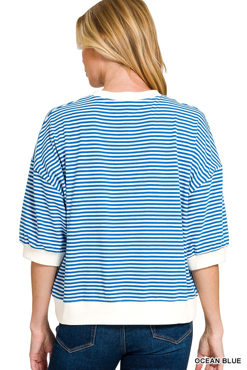 The Striped Contrast Trim Banded Bottom Top is a fashionable and versatile piece that will enhance your everyday look. With its striped design and contrasting trim details, this top offers a modern and chic aesthetic. The banded bottom adds a touch of structure and style to the overall silhouette. Pair it with jeans or trousers for a polished and sophisticated outfit suitable for various occasions. Elevate your wardrobe with this stylish top that effortlessly combines comfort and trendiness.
