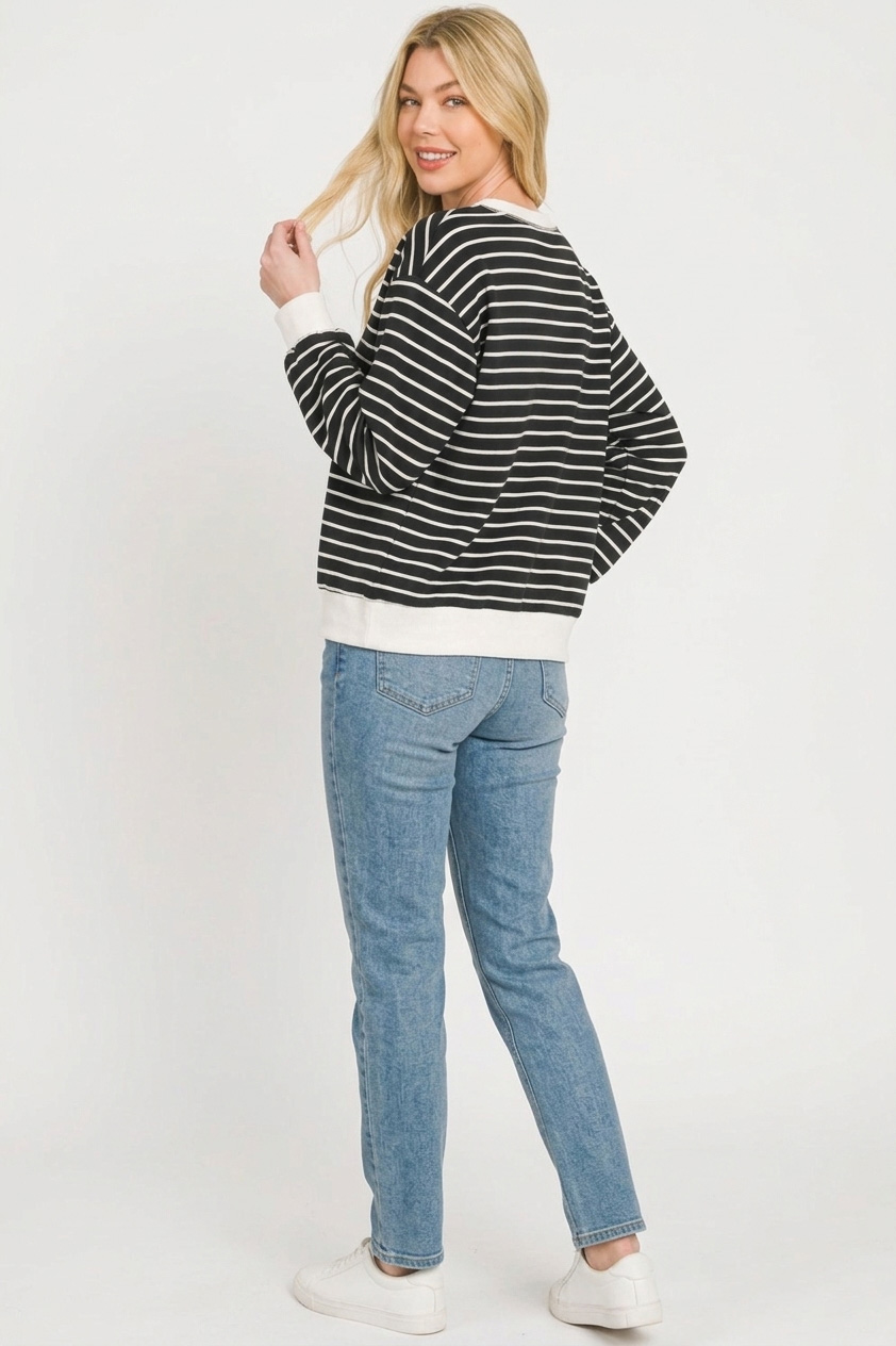 This striped print long sleeve pullover sweatshirt is a must-have for your casual wardrobe. Made from a soft and cozy blend of cotton and polyester, this sweatshirt offers both comfort and style. The classic striped pattern adds a touch of timeless appeal, while the relaxed fit ensures all-day comfort. Perfect for layering or wearing on its own, this sweatshirt is versatile enough for any occasion. The durable construction ensures long-lasting wear, making it a great investment for your wardrobe.