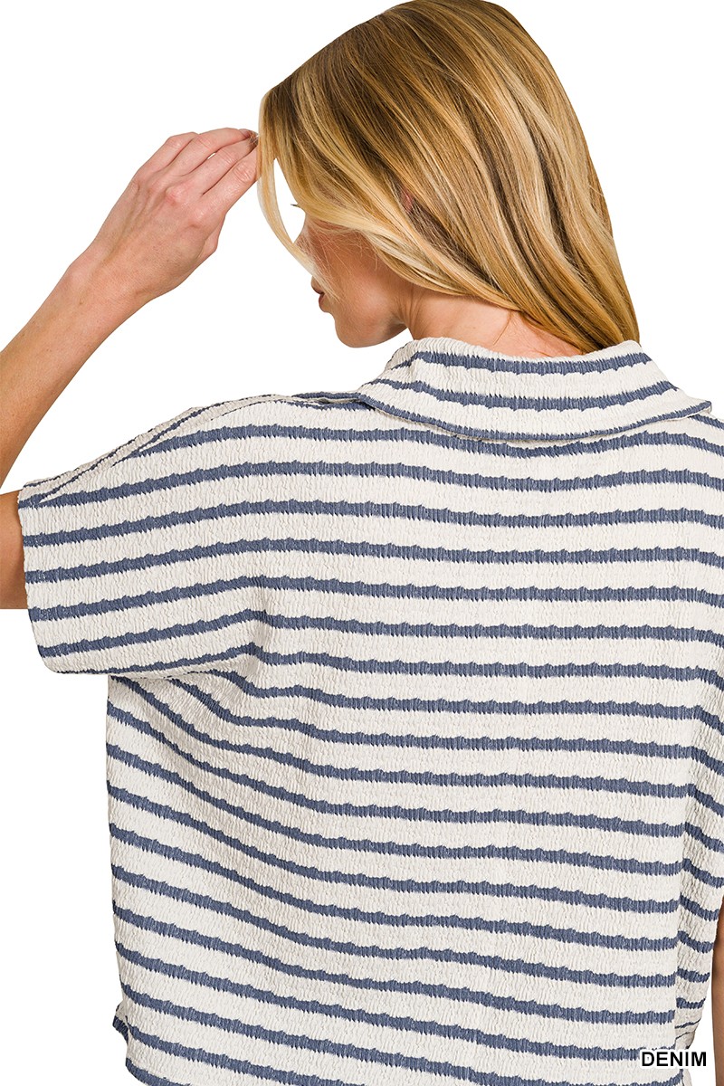 Zenana Striped Split Neck Collared Top