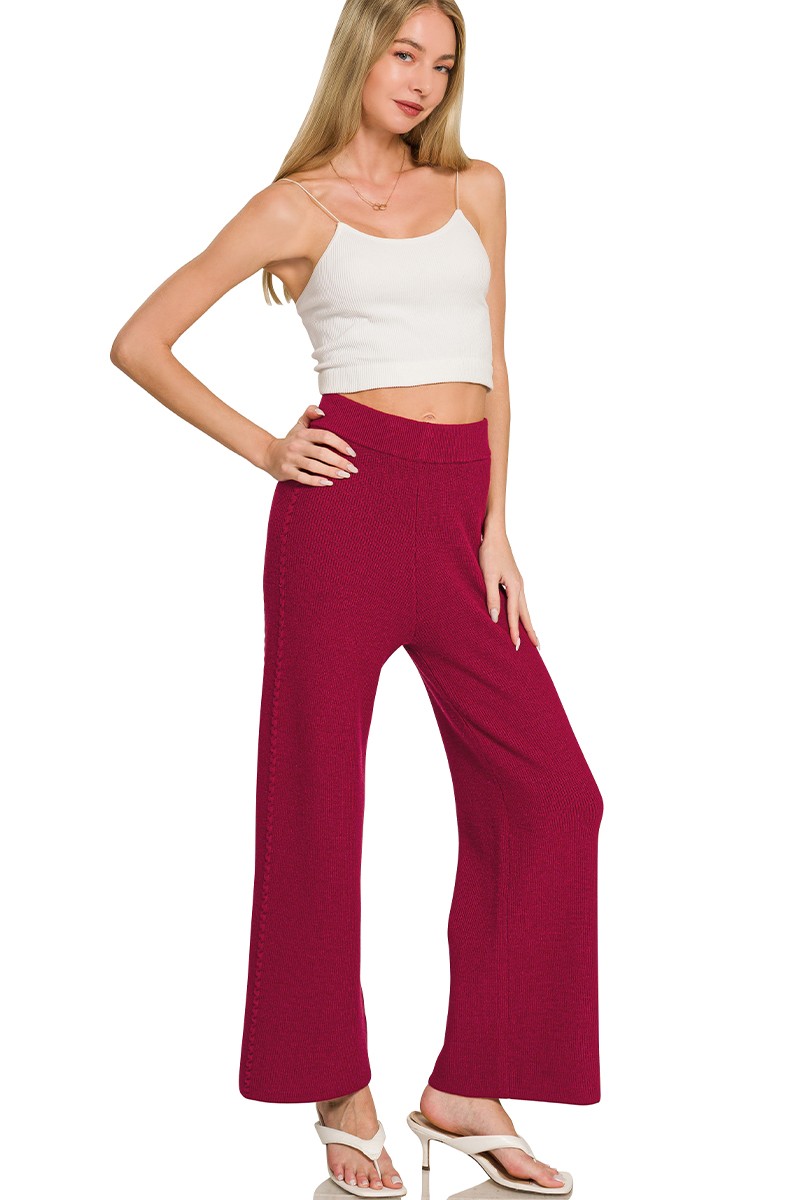These ribbed high-waisted wide-leg sweater pants offer a blend of comfort and style. Crafted from a soft, cozy knit material, they provide a comfortable fit and a flattering silhouette. The high-waisted design accentuates the waistline, while the wide-leg cut adds a touch of sophistication. The ribbed texture enhances the visual appeal, making these pants a versatile addition to any wardrobe. Perfect for lounging at home or dressing up for a casual outing, these sweater pants are a must-have for those seeking both comfort and fashion.