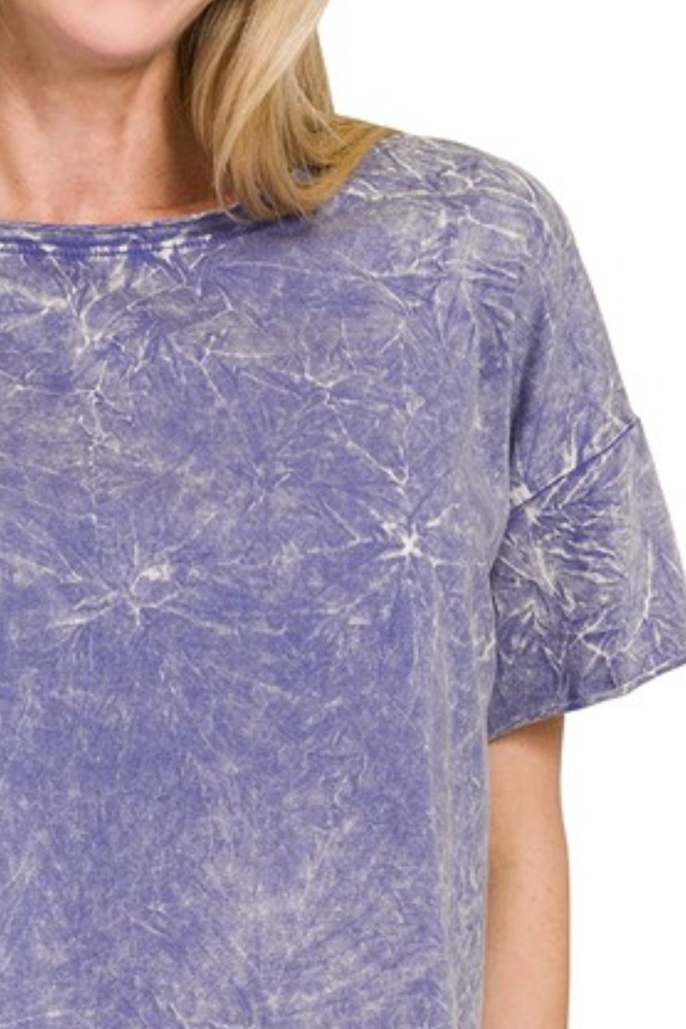 This stylish vintage washed t-shirt features a unique purple tie-dye effect that creates a fashion, lived-in look. Made from a soft cotton blend material, it offers exceptional comfort and breathability for all-day wear. The relaxed fit design with dropped shoulders provides a modern, oversized silhouette that's perfect for casual occasions. The round neckline and short sleeves make it ideal for layering or wearing on its own. This versatile piece easily pairs with jeans, shorts, or skirts for effortless style.