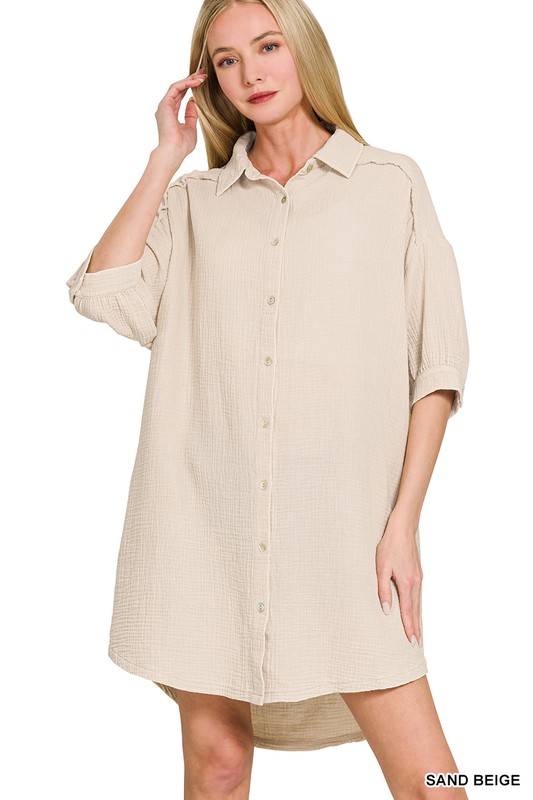 Zenana Washed Double Gauze Button Down Shirt Dress