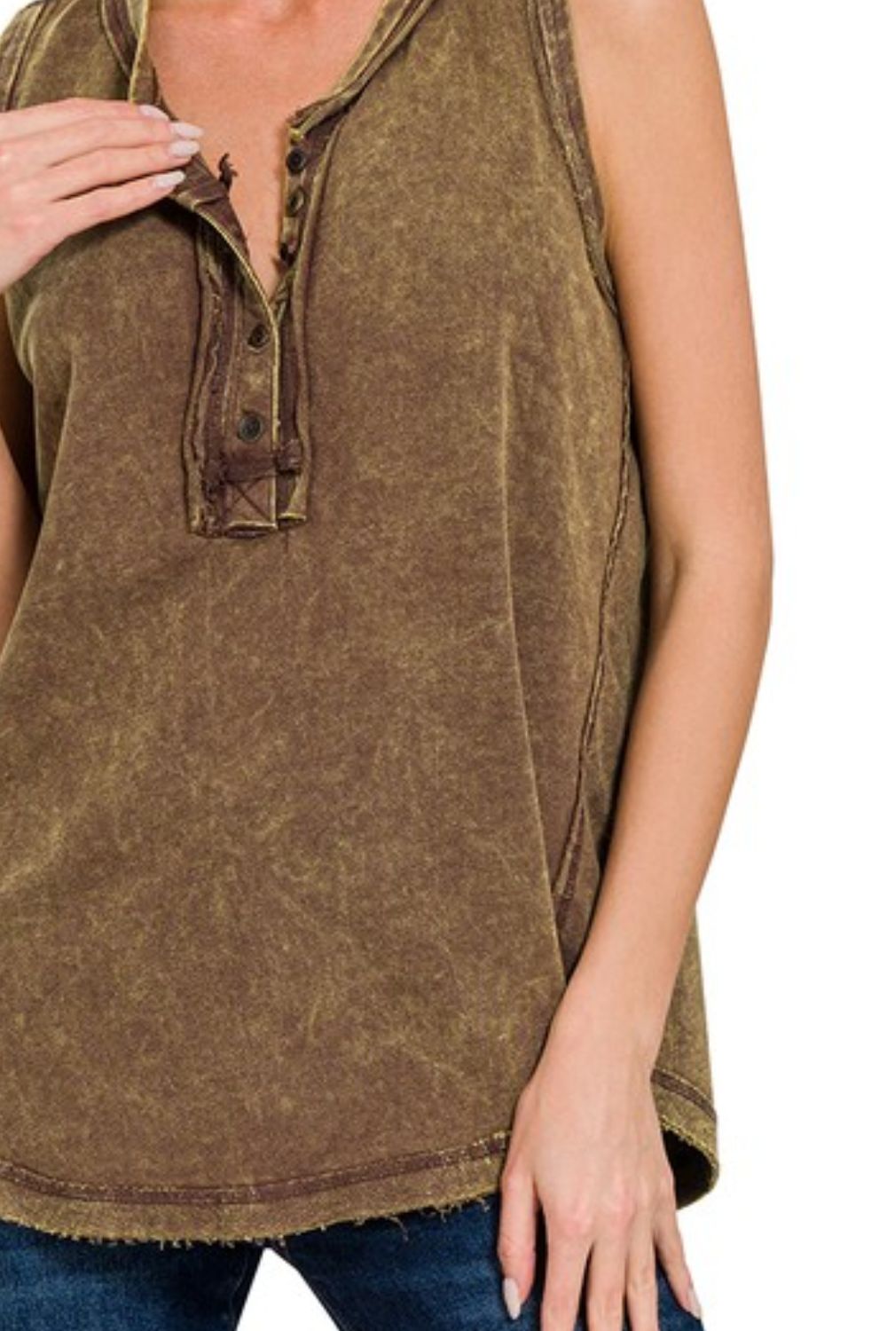 This stylish hooded tank top features a unique vintage mineral wash treatment in a rich olive brown color. Made from a soft cotton blend fabric, it offers exceptional comfort and breathability. The standout lace-up front detail with grommets adds an edgy bohemian touch, while the attached hood provides both style and functionality. The relaxed fit and curved hemline create a flattering silhouette that pairs perfectly with jeans or shorts. The garment's acid wash finish gives each piece a unique, lived-in character that's perfect for casual everyday wear or festival fashion.