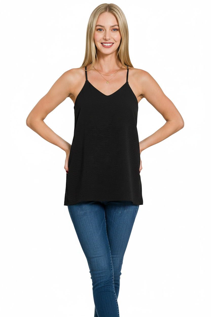 The woven airflow adjustable strap V-neck cami top is a versatile and stylish addition to your wardrobe. The adjustable straps allow for a customized fit and comfortable wear. The V-neck design adds a touch of femininity and sophistication to the top. Made from woven fabric, this cami top offers breathability and ease of movement. Pair it with jeans, shorts, or a skirt for a chic and effortless look.