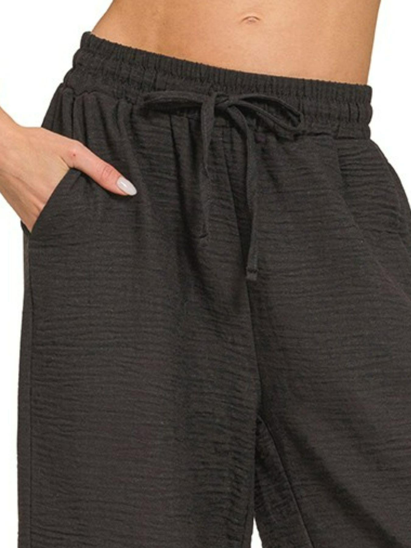 Woven Crepe Elastic Band Pants are a fashionable and versatile addition to your wardrobe. The woven crepe fabric provides a polished and structured look, making these pants suitable for both casual and dressy occasions. The elastic band at the waist ensures a comfortable and flattering fit, while also allowing for easy movement throughout the day. The pants can be styled in various ways, such as pairing them with a blouse for a chic office look or with a casual top for a more relaxed ensemble. Their versatility and comfort make them a great staple piece for any wardrobe.