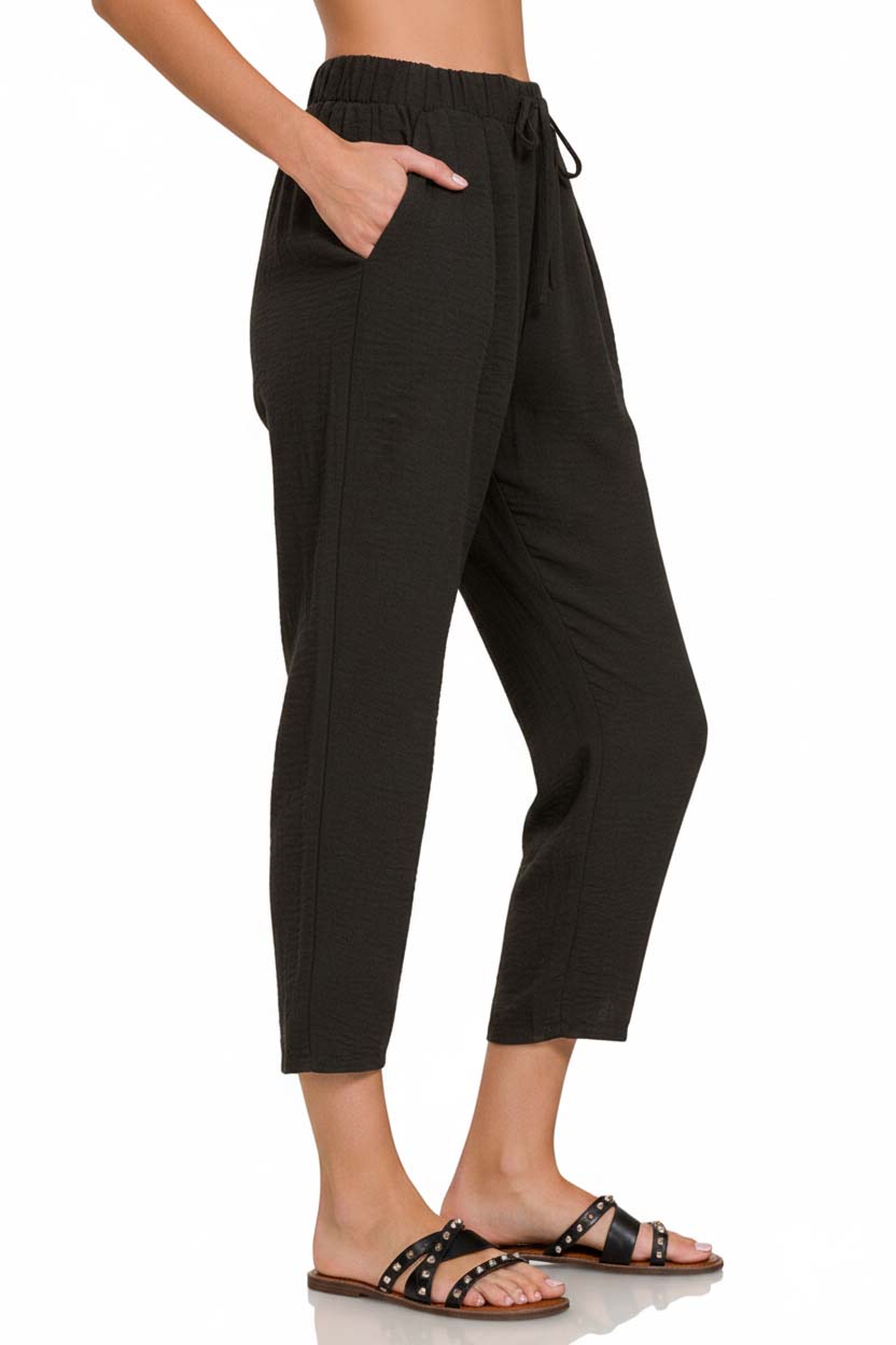 These Woven Crepe Elastic Band Waist Pants combine style and comfort for a versatile wardrobe staple. The woven crepe fabric gives a sleek and polished look while offering flexibility and ease of movement. The elastic band waist ensures a comfortable and adjustable fit. Pair these pants with a blouse for a professional look or with a casual top for a relaxed outfit. Elevate your everyday style with these sophisticated and practical Elastic Band Waist Pants in woven crepe fabric.