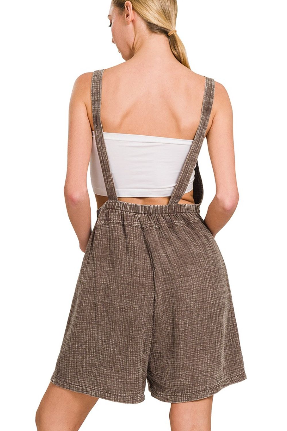 The Woven Double Gauze Acid Washed Romper features a unique and trendy acid-washed design. It is made from lightweight double gauze fabric for a soft and comfortable fit. This romper is a stylish and versatile choice for any casual occasion.