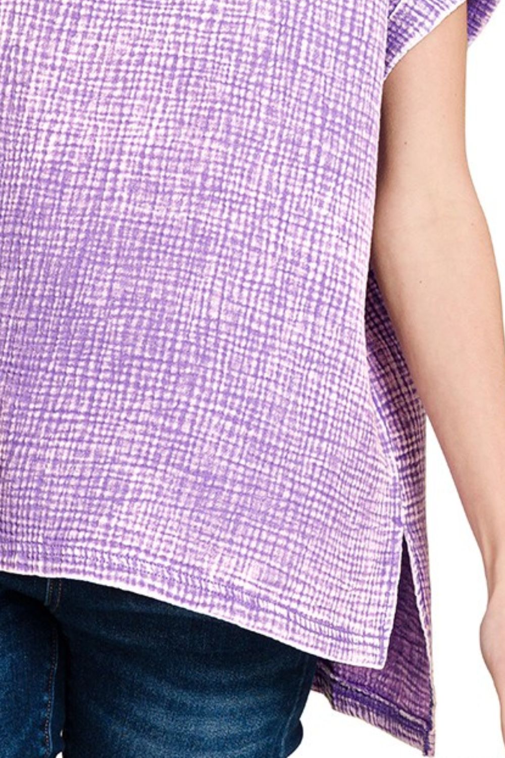This stylish lavender T-shirt features a relaxed fit design with textured fabric that offers both comfort and visual appeal. Made from soft, breathable material perfect for casual wear. The asymmetrical hem and side slit details add a modern touch to the classic T-shirt silhouette. Short sleeves provide comfortable coverage while the round neckline offers a flattering fit. Ideal for everyday wear, this versatile piece can be dressed up or down and pairs perfectly with jeans, shorts, or skirts. The textured weave adds dimension and interest to the garment while maintaining easy care properties.