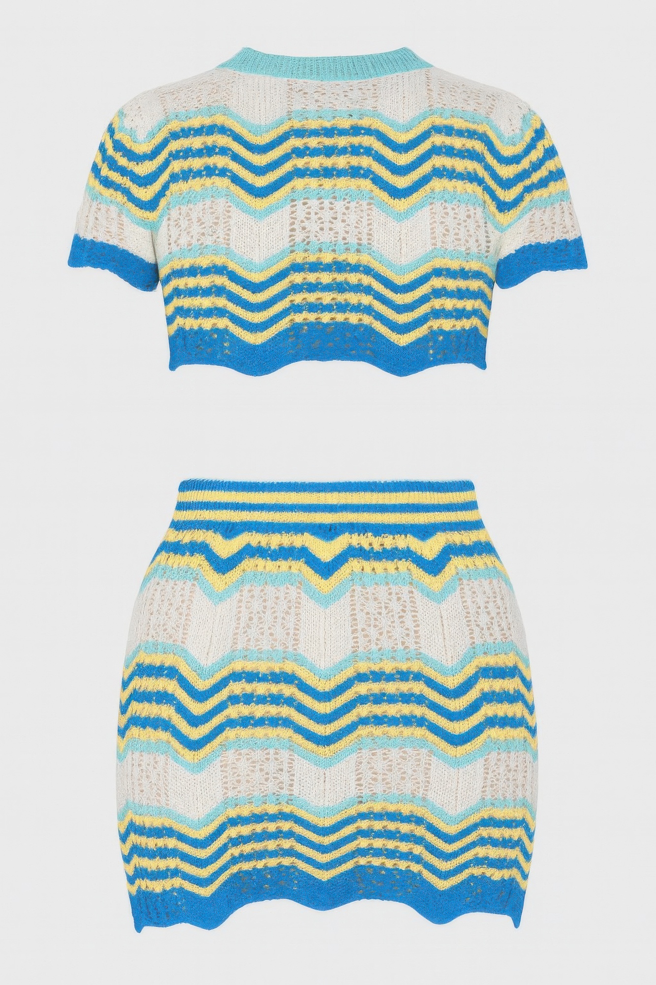 Bright, bold, and irresistibly fun, this zig zag crochet two-piece set captures the essence of carefree style. Featuring a colorful crochet crop top paired with a matching mini skirt, it delivers a perfect mix of playful texture and eye-catching design. The multicolor zig zag pattern adds a retro-inspired flair, while the soft, stretchy fabric ensures comfort and a flattering fit. Perfect for summer outings, festivals, or beachside adventures, this set radiates effortless charm and confidence.
